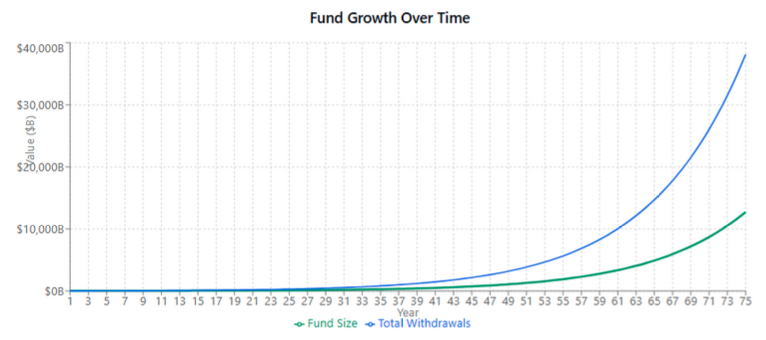 Scenario: 40% annual returns with 10% reinvestment model [Note: Specific calculations would show the fund's exponential growth while simultaneously deploying hundreds of billions toward humanity's greatest challenges]